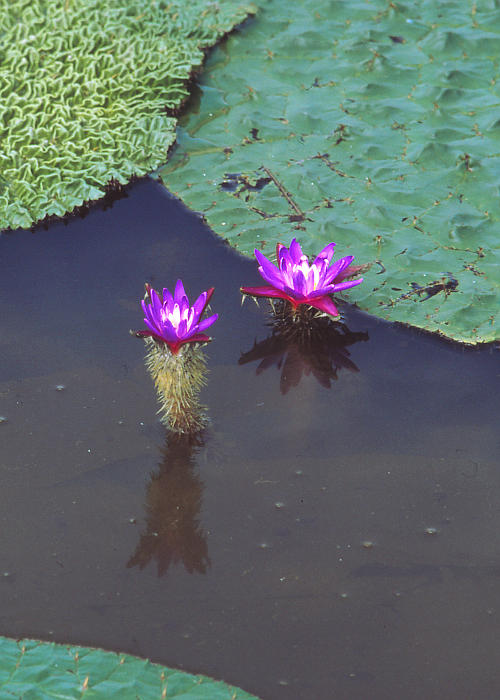花は長い花柄の先に1個つき、径約4cm。花弁は多数あり、広披針形〜倒披針形で鈍頭、紫色、長さ6〜10cm。雄しべは多数あり、花糸の長さは不揃いで葯は長さ3〜3.5mm。子房下位で普通8室あり、柱頭は盤状でへこむ。萼片は4個、長楕円状披針形で鈍頭、長さ約20mm、緑色で外面に刺があり、基部で合着して萼筒となり、内面は紫色。花は昼開き、夜閉じる。水中には多数の閉鎖花をつける。
