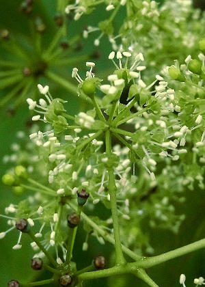 花は本年枝の先に円錐花序を伸ばし、散形に多くの花をつける。花は黄緑色で両性または単生、単生の場合は上部に雌性、まわりに雄性の小花序をつける。花弁は5個、狭卵形で長さ約1.5mm、雄しべは5個、長さ約2mm。花柱は短く先が浅く2裂する。