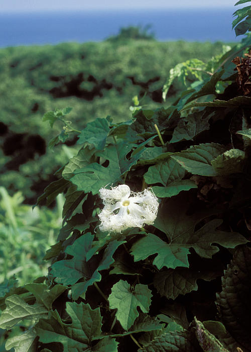 葉は互生、葉身は円心形、5〜7中〜深裂し、表面は濃緑色で光沢がある。