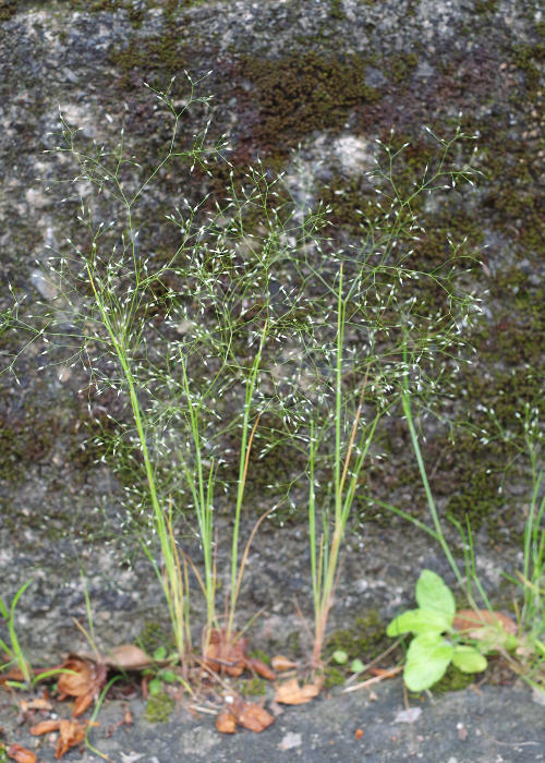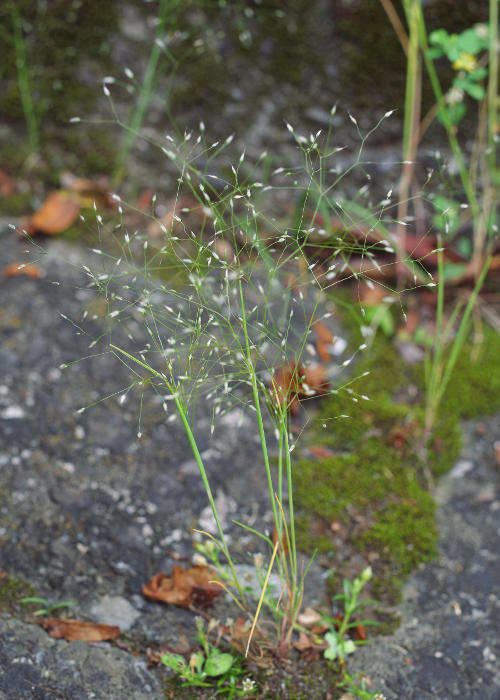 花は枝先に長さ5〜11cmの円錐花序となり、細かく枝を分け、全体に小穂をつける。花序の枝は平滑。小穂は長さ1.5〜2mm、小穂の柄は普通小穂の2倍以上の長さがあり、ざらつく。普通第1小花には芒がなく、第2小花だけに芒がある(稀に両方に芒がある場合もある)。