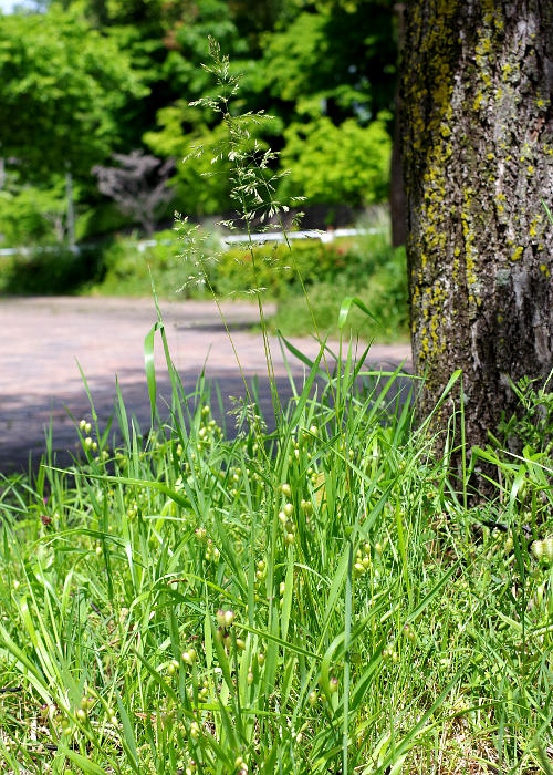 明治時代の初めにケンタッキー・ブル−グラスの名で導入された牧草で、戦後に緑化や砂防用に使われたため、広く野生化した。