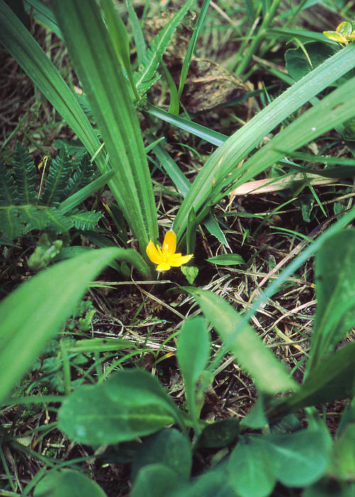 すると、葉の根元にくっつくように黄色の花が咲いている。コキンバイザサかと思って撮影した。ずっと疑っていなかったが、ある時フィルムをチェックするとこの花だった。その時は長い花柄があると思っていたのだが。