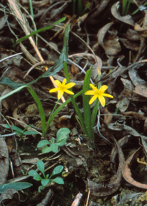花は葉の根元の葉腋から5〜10cmの花茎の先に1〜2個つく。苞は線形で膜質、長さ5〜8mm。花被片は6個、下部は筒状にならず、黄色、披針状長楕円形で半開し、長さ4〜6mm。花全体に毛があるが、特に外花被片の先端背面に多い。雄しべは6個、花被片の基部につき、葯は線形〜卵形で基部が凹み、長さ1.5〜2.5mmと花糸より短い。子房の上部は嘴状の突起にならず、花柱は長さ2〜3mm、柱頭は3個、直立して柱状、長さ1〜2mm。