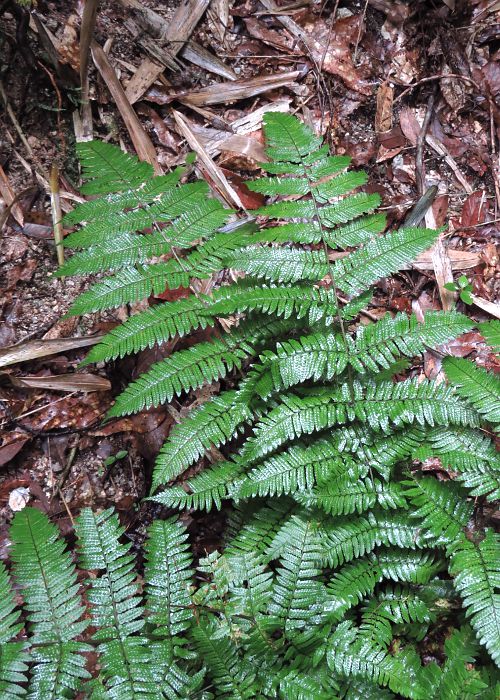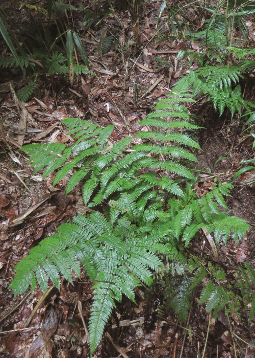 最初に訪れたのは、広島市東部の丘陵の谷間、ホソバヤマヤブソテツ、ツクシイワヘゴなど初めて見るシダに加えこのシダも多数生えていた。