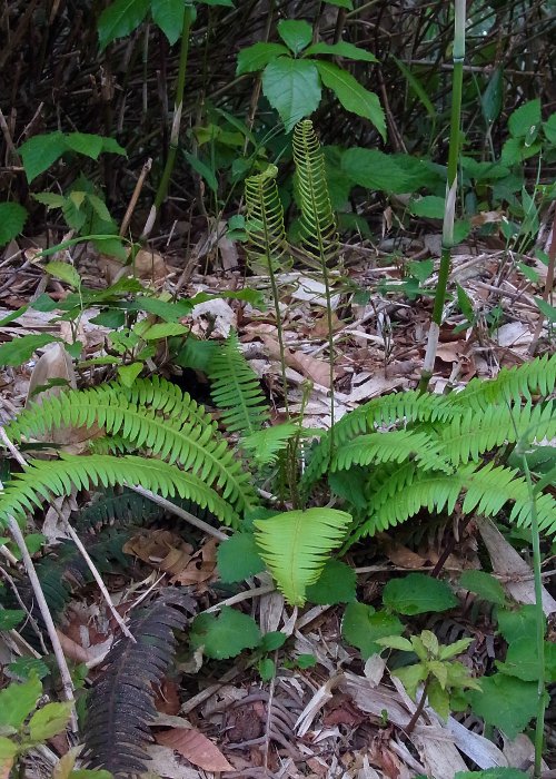 常緑のシダであるが、新葉は時にやや赤みを帯びることがあり、常緑の緑色との対比はなかなか美しい。